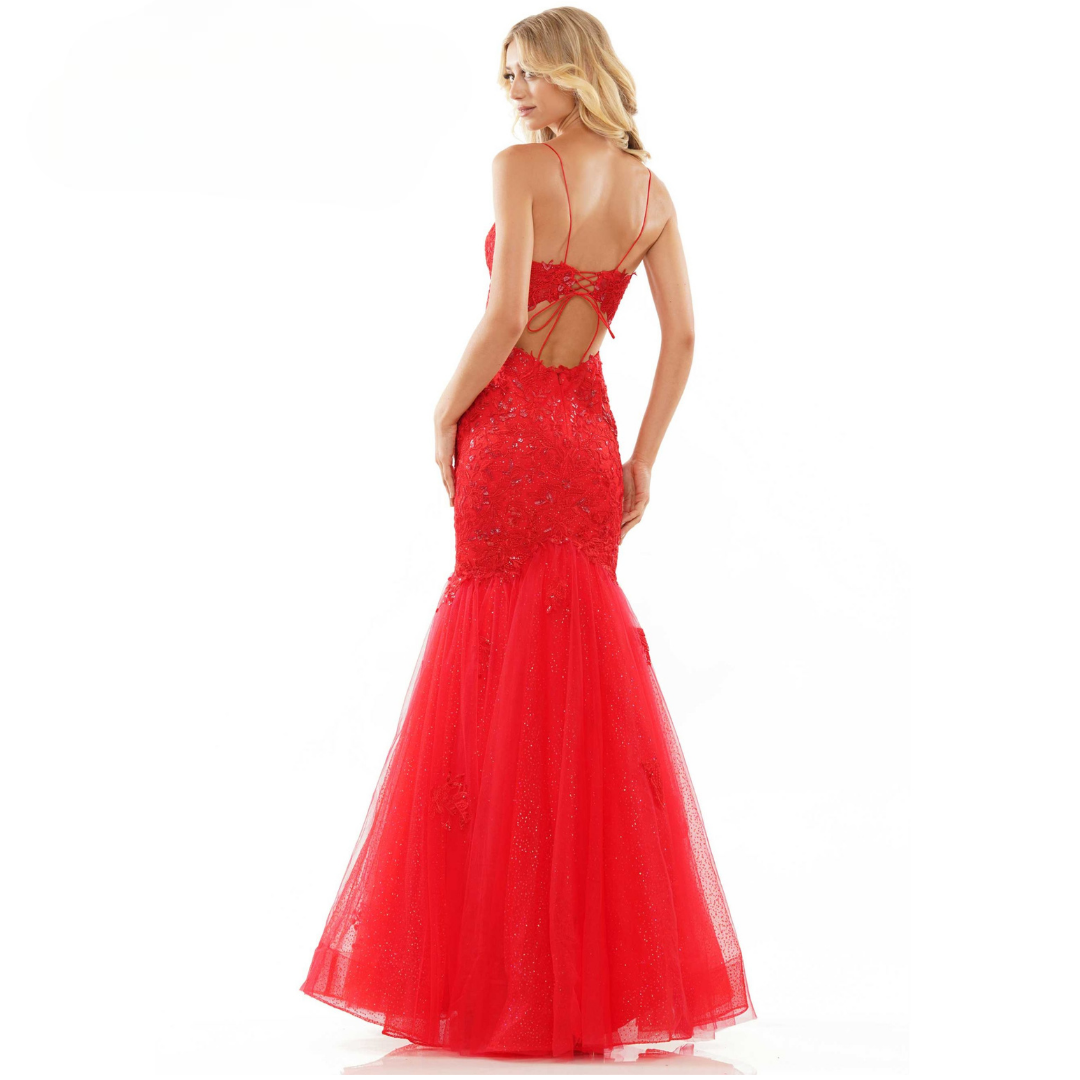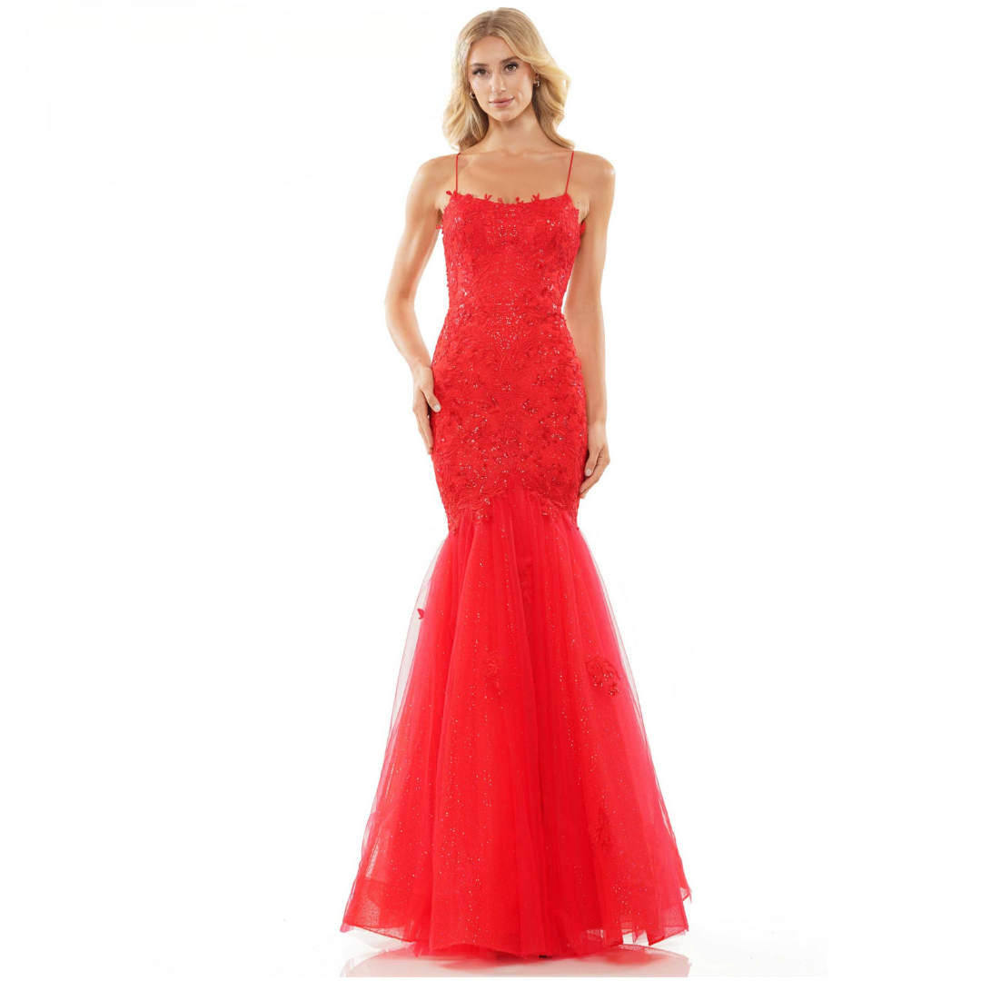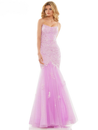 This unique gown is so stunning! Cut in a mermaid fashion, this dress accentuates all the right places. The entire dress is adorned with stunning floral detailing and scattered rhinestones. The bodice features a scooped neckline, spaghetti straps, and a beautiful corset back to complete the look. Above the knees, the tight fitting skirt transforms into soft layers of tulle, adorned with floral appliques. This dress is stunning, and would be perfect for any event, including pageant or prom!