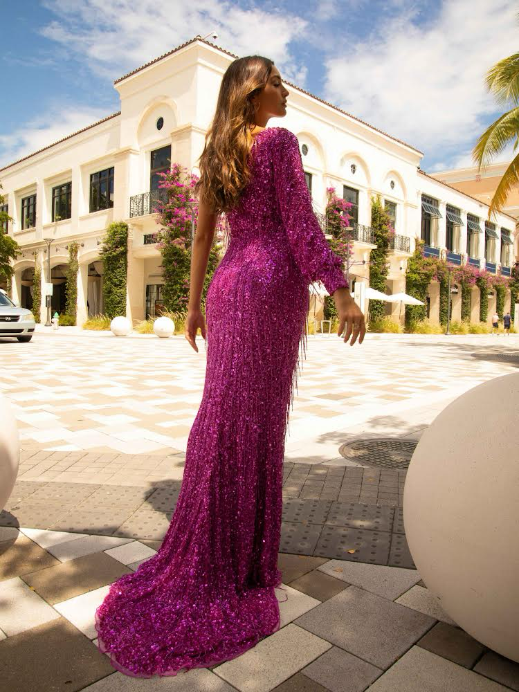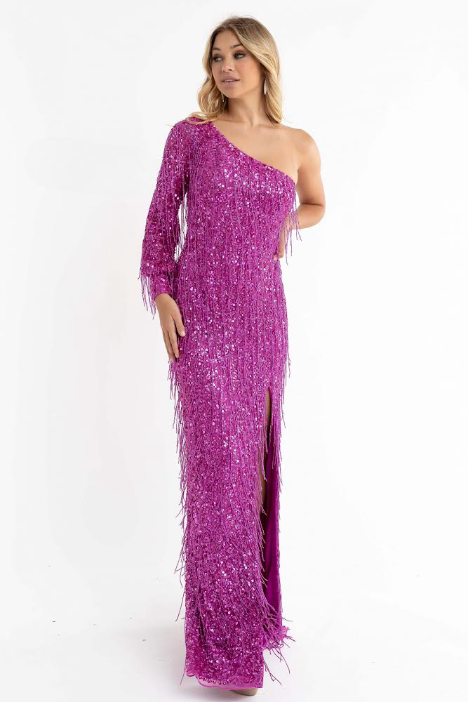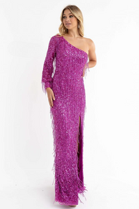 This dazzling gown is designed to make a statement with its bold silhouette and striking details. The one-shoulder neckline offers a modern, asymmetrical touch, paired with a long sleeve adorned in fringe that adds movement and flair. Fully embellished in sequins, the dress catches the light from every angle, while cascading fringe creates a dynamic, shimmering effect. A thigh-high slit adds just the right amount of drama, balancing elegance with allure. The fitted shape flows into a subtle train, ensuring you’ll sparkle with every step. Perfect for prom, pageants, or any event where you want to shine, this gown is pure show-stopping glamour.