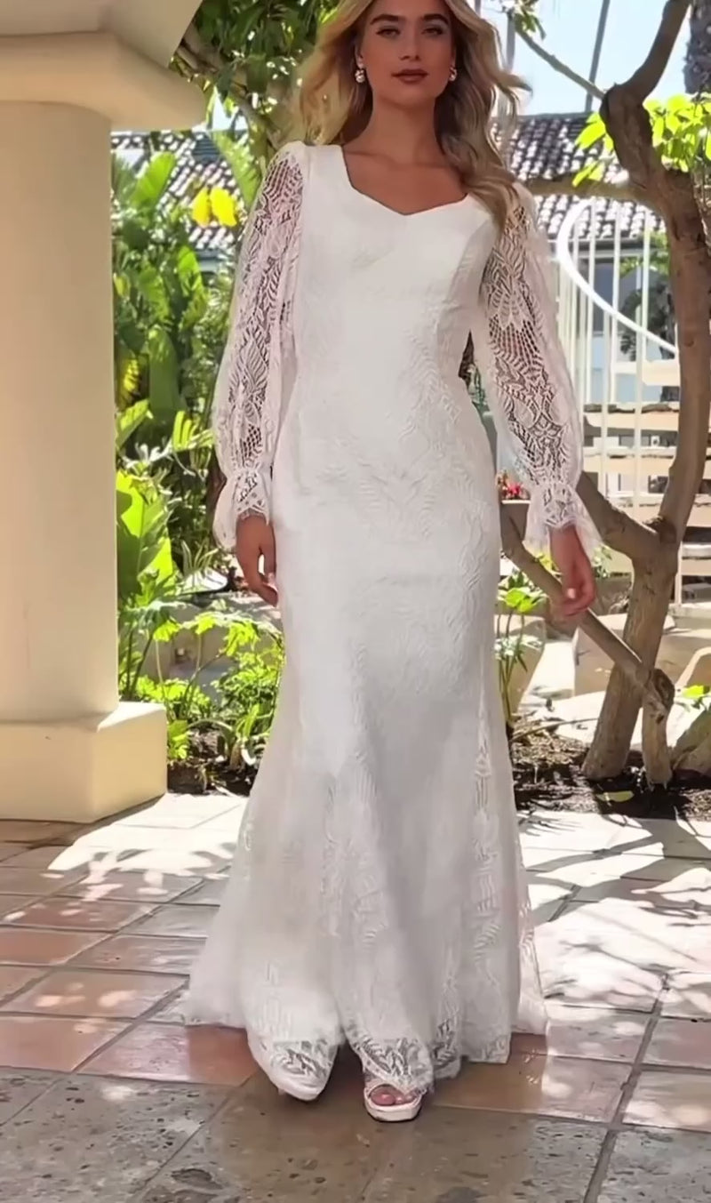 Designed in a soft, figure-flattering sheath silhouette, this gown highlights your natural shape while offering comfort and graceful movement. The entire dress is crafted from intricate lace that brings texture and sophistication from neckline to hem.