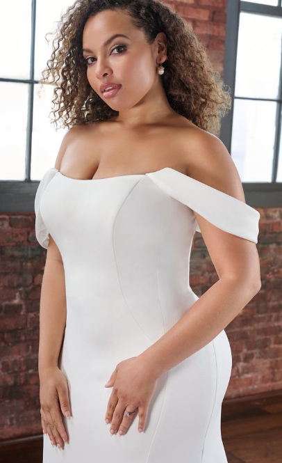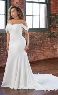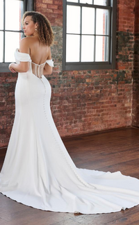 The Rasha gown is crafted in smooth crepe, this figure-hugging silhouette highlights the bride’s natural curves before flowing into a dramatic chapel-length train. The off-the-shoulder straps drape effortlessly for a soft, romantic feel, while the structured bodice with exposed corset detailing in the back adds a touch of modern allure. A row of covered buttons trails seamlessly from bodice to hem, offering timeless elegance from every angle.
