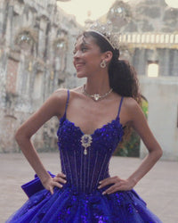 Make your grand entrance in the enchanting Sophie quinceañera gown. This royal ballgown features a glittering tulle skirt that sparkles with every step and a sheer corset bodice adorned with delicate floral appliqués and crystal beadwork. The lace-up back ensures a flawless fit, while the statement bow adds a touch of fairytale charm. Sophie is made for the modern princess, elegant, radiant, and unforgettable on her special day.