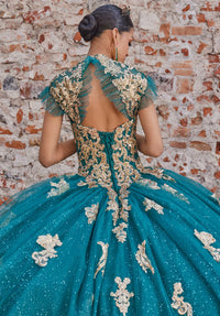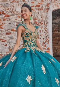Step into your royal moment with this breathtaking teal quinceañera gown — a showstopping masterpiece fit for a modern-day princesa. The luxurious ballgown silhouette is brought to life with layers of sparkling tulle that shimmer with every twirl, while rich golden embroidery cascades down the bodice and skirt in ornate baroque-inspired patterns. Delicate cap sleeves and a sweetheart neckline create a regal yet romantic touch, complemented by a stunning illusion back with ruffled tulle detailing and a graceful keyhole opening. The entire look is crowned with matching gold appliqués and a jeweled tiara, making this gown a true statement of elegance, confidence, and celebration. Perfect for the quince queen ready to dazzle the world on her big day.