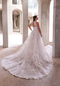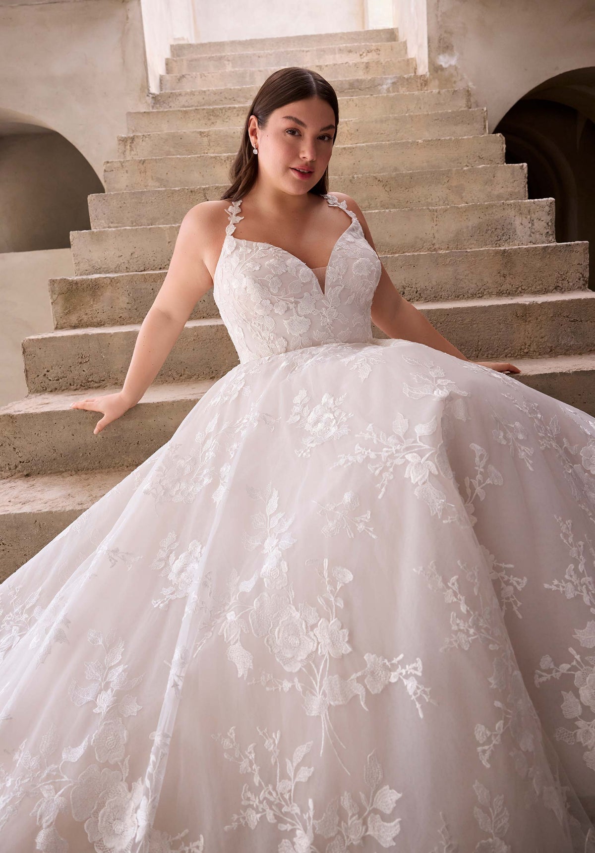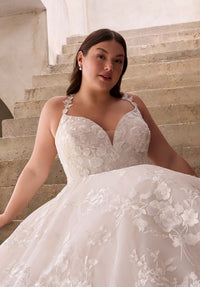 Soft, romantic, and beautifully detailed, Brenley is the gown of floral daydreams. This enchanting A-line dress features a plunging neckline with delicate lace straps that frame the shoulders with grace. The bodice is adorned with dimensional floral appliqués that trail seamlessly into a flowing skirt of airy tulle, creating movement as light as a whisper. With its layered floral embroidery and timeless silhouette, Brenley captures the essence of romance for the bride who wants to feel both ethereal and effortlessly elegant.