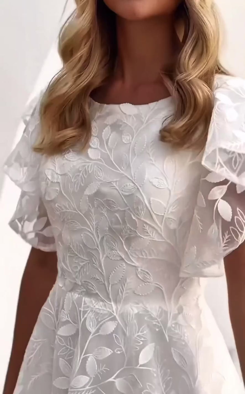 Crafted in a beautifully detailed floral lace, this gown showcases an allover botanical pattern that adds depth, texture, and delicate movement from bodice to train. The classic scoop neckline offers a timeless, modest silhouette, while the flutter sleeves steal the spotlight with their soft, layered design — creating an airy, ethereal finish.