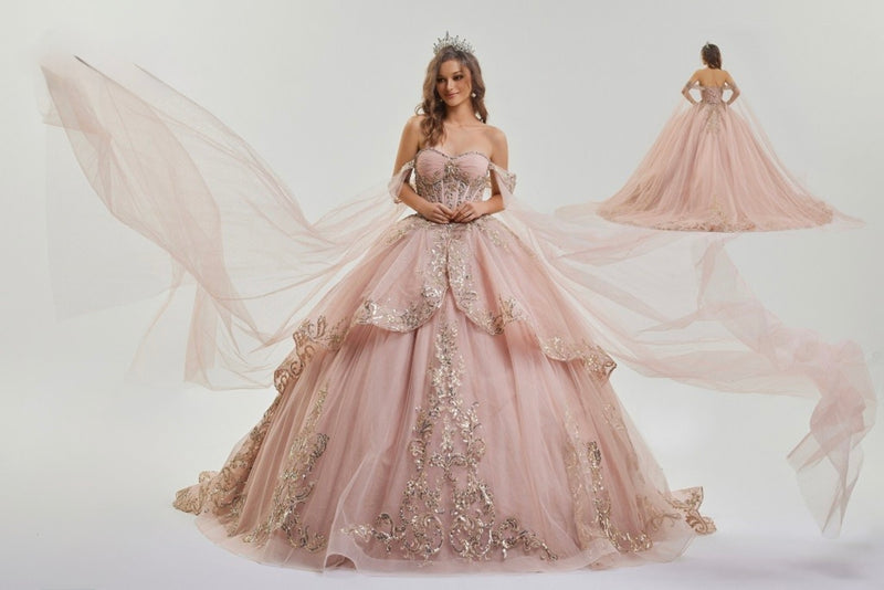 Fit for royalty and made for your most unforgettable moment—this blush pink quinceañera gown is a true showstopper. Featuring a structured corset bodice adorned with intricate gold embroidery and sparkling beadwork, this gown effortlessly blends modern glamour with classic princess elegance. The voluminous layered tulle skirt cascades with shimmering details, while the off-the-shoulder sleeves and regal train add the perfect touch of drama. Whether you’re twirling through your first dance or making your grand entrance, this gown promises to make every moment magical.