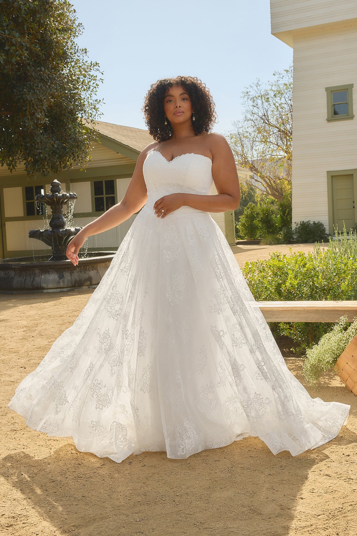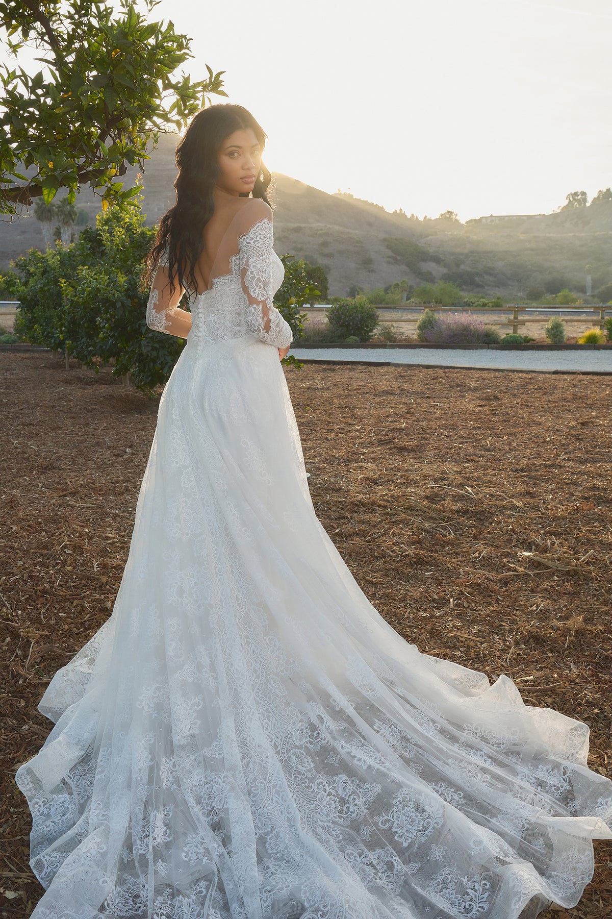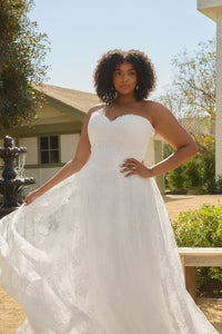 Set amidst the golden glow of an orchard at sunset, Julia embodies effortless romance and natural beauty. This enchanting A-line gown features a delicate scalloped sweetheart neckline that gracefully frames the décolletage, leading to a Basque waistline. Layers of soft tulle and Chantilly lace flow from the fitted bodice into a sweeping train, creating an ethereal effect with every step. Designed for the bride who dreams of a gown as breathtaking as the setting around her, Julia is the perfect blend of whimsy and sophistication.