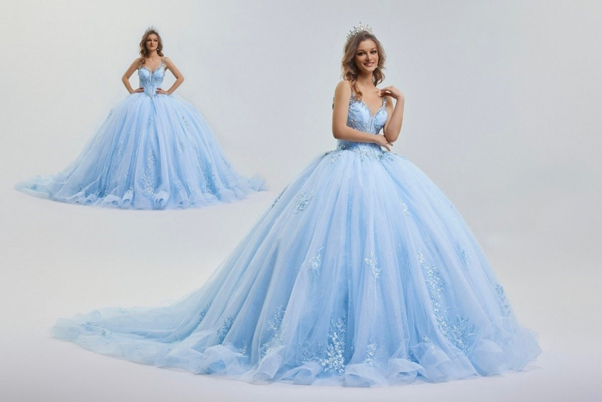 Step into your fairy tale moment with Rosario, a breathtaking quinceañera gown that radiates elegance and enchantment. This dreamy ball gown features layers of soft, sky-blue tulle adorned with delicate floral appliqués and subtle sparkles that shimmer with every twirl. The fitted bodice is designed with a romantic sweetheart neckline and dainty spaghetti straps, offering a graceful silhouette that flatters while still feeling youthful and regal. A dramatic, voluminous skirt flows into a sweeping train, perfect for making a grand entrance. Finished with a subtle corset back and crown-worthy details, Rosario is the ultimate gown for a modern-day princess celebrating her magical 15.
